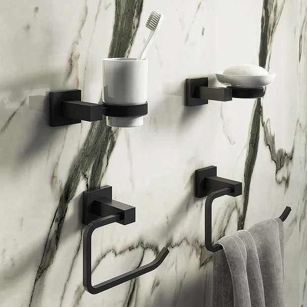 The eye-catching Arezzo Square modern wall mounted bathroom accessory package has been manufactured to a very high standard. It’s stylish and practical contemporary design integrates seamlessly into any bathroom décor. This quality accessory pack has been manufactured using high grade materials and comes in a durable matt black finish.