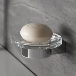The Keuco Plan accessory range offers a wide collection of practical products to choose from. This wall mounted soap dish and holder comes in a stylish yet functional design and features a rounded chrome bracket and crystal glass soap dish.